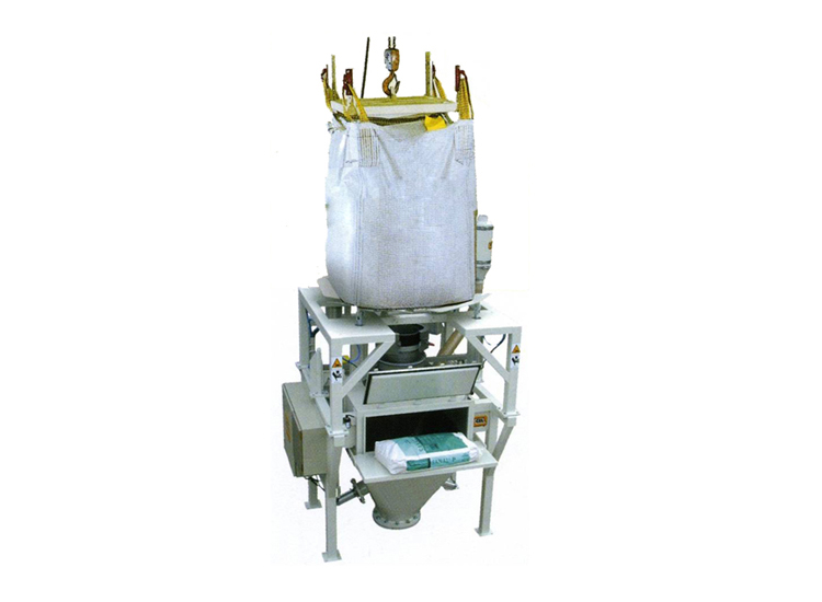 噸包拆包機,噸袋卸料機將噸袋包裝物料提升到進料口,人工將包裝袋下料口拆開后,打開流量控制閥和帶附帶的振動下料裝置促使包裝袋內的粉粒狀物料通過自重落到下方料斗中。